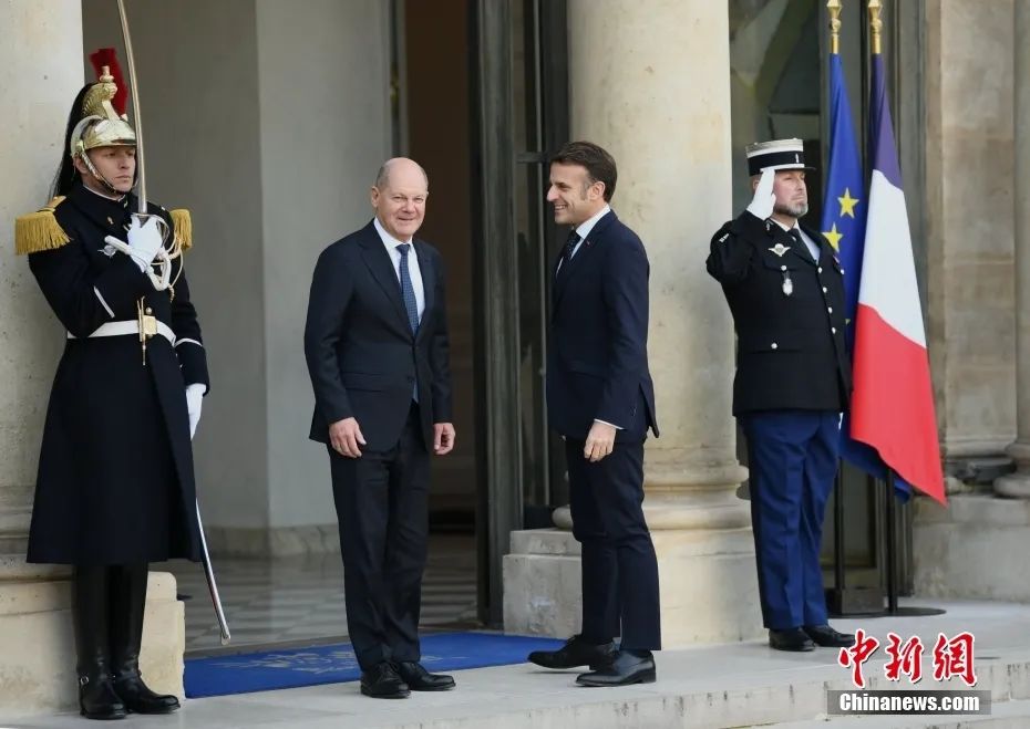 當地時間2月17日,歐洲主要國家領導人在巴黎會晤,商討地區安全局勢。圖為法國總統馬克龍在巴黎愛麗捨宮迎接德國總理朔爾茨。中新社記者 李洋 攝