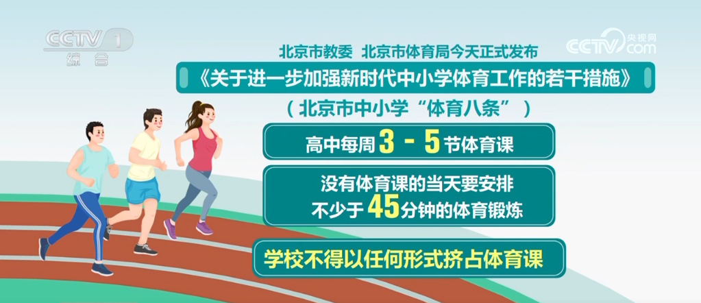 在北京市教委、北京市體育局2月17日正式發佈的《關於進一步加強新時代中小學體育工作的若干措施》,即北京市中小學“體育八條”中還明確,高中每週3—5節體育課,沒有體育課的當天要安排不少於45分鐘的體育鍛煉,學校不得以任何形式擠佔體育課。文件還要求學校充分利用大課間和課後服務,組織學生開展球類、跳繩、踢毽、跳皮筋等不少於10個項目的輪換活動,確保義務教育階段每名學生掌握至少2項運動技能。