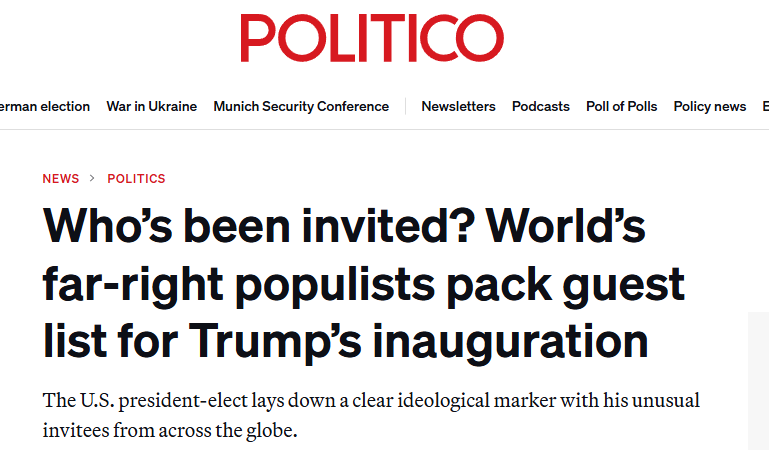同時,根據美國“政治”網站歐洲版的報道,特朗普在今年1月20日宣誓就職時,也邀請了大量來自歐洲乃至其他各地的民粹保守派勢力參加。