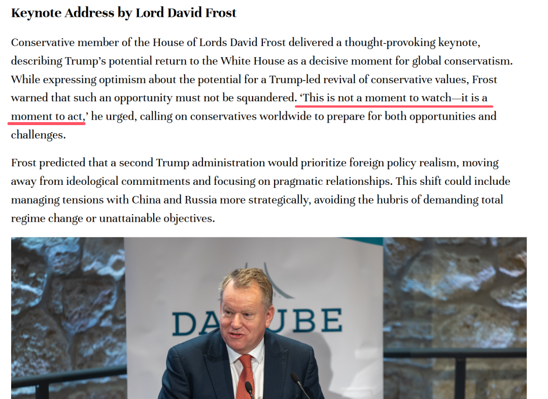 比如,在去年11月19日,曾主導英國脱歐談判的英國保守派政客大衞·弗羅斯特,就在一次公開發言中表示,全球保守運動迎來“關鍵時刻”,將令保守派價值觀復甦。他甚至呼籲歐洲的保守派不要做觀望者,而是要“行動起來”。