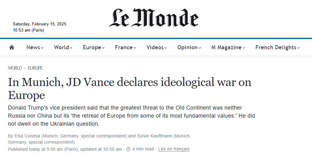 法國的《世界報》,在週末一篇報道萬斯的文章中,終於將萬斯看歐洲如此不順眼的一個重要原因寫了出來,甚至將這個原因打在了標題上:在慕尼黑,萬斯在“意識形態”上,對歐洲宣戰。