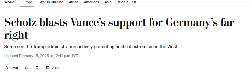 而在今年2月5日的另一篇報道中,美國“政治”網站歐洲版更表示,在當時於西班牙馬德里舉行的一場歐洲極右翼政黨的國際會議上,來自法國、荷蘭、意大利、匈牙利等一眾歐洲國家的相關政黨,打出了“讓歐洲重新偉大”的政治標語,躍躍欲試。實際上,比起萬斯在巴黎或慕尼黑安全會議上的發言,這種美國保守派力量與歐洲民粹保守派合流,對歐洲各國政治的直接滲透乃至干涉,才是讓歐洲傳統派別的政治勢力最害怕也最牴觸的。德國方面這次對萬斯見魏德爾的反應相當激烈,就是這種恐懼與牴觸的一次展現。
