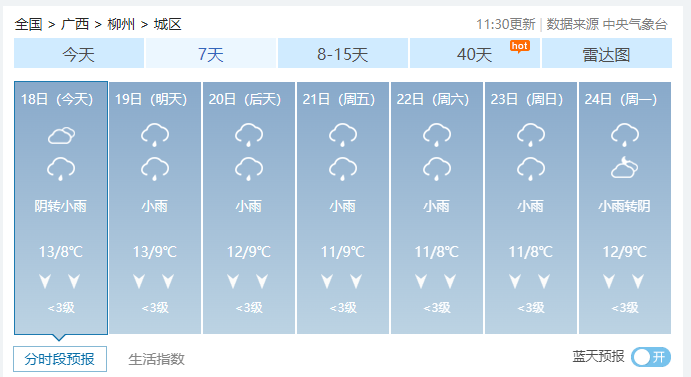 預計未來三天,我區持續陰雨天氣,其中桂北局地有中到大雨,桂南部分地區有霧和輕度回南潮濕天氣;20日,冷空氣南下影響到桂北,桂東北高寒山區局地有雨夾雪或凍雨。