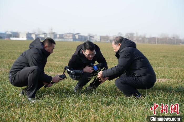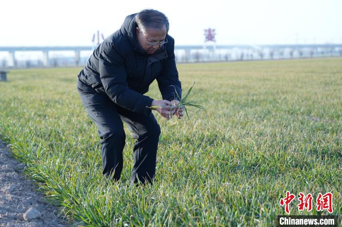 2月16日,茹振鋼在麥田裏察看苗情。 中新社記者 闞力 攝