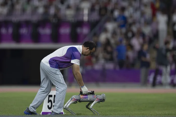 2023年杭州亞運會田徑鐵餅賽場上,宇樹科技研發的電子機器狗化身“搬運工”,在賽場來來回回運送鐵餅,極大節省了工作人員的體力。