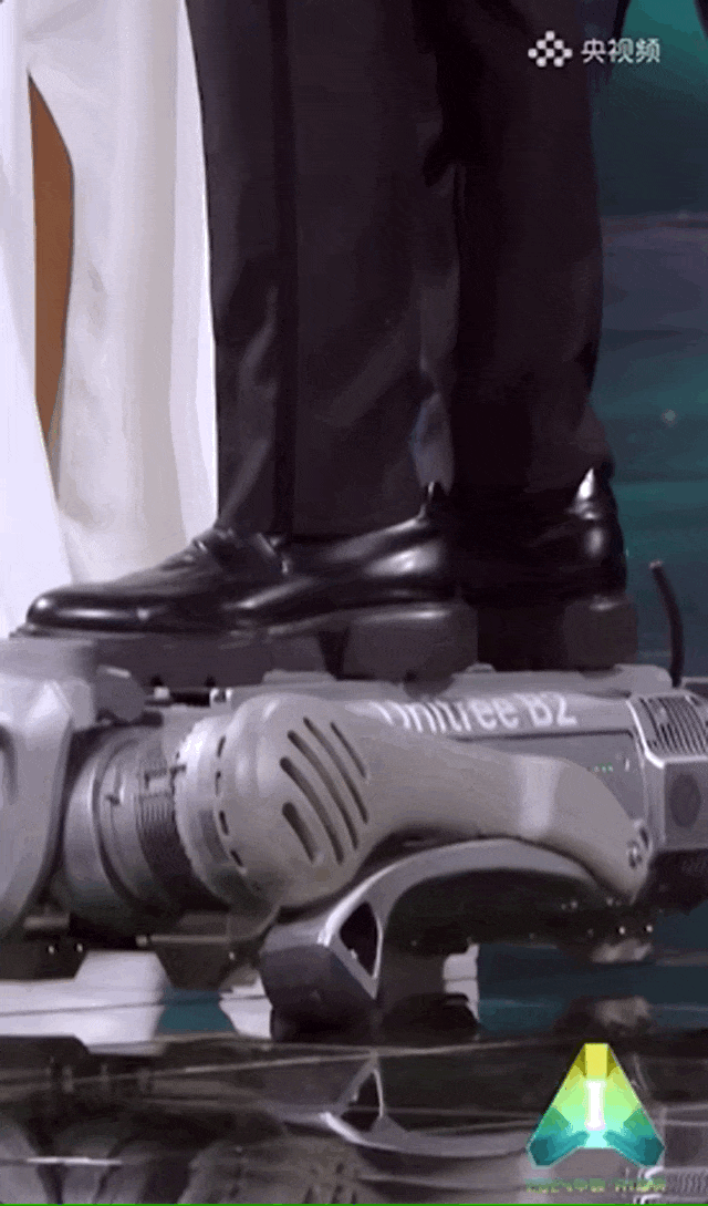 宇樹科技的四隻機器狗也曾在總枱亮相,其中寵物機器狗“糯米”能夠在家裏陪伴老人、小孩,能負重100多公斤的機器狗“大白”,現場將主持人尼格買提高高馱起。