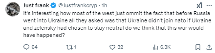 還有網友説,“有趣的是,大多數西方國家都忽略了這樣一個事實:在俄羅斯進入烏克蘭之前,他們所要求的只是烏克蘭不要加入北約,如果烏克蘭和澤連斯基選擇保持中立,我們覺得這場戰爭還會發生嗎?”↓