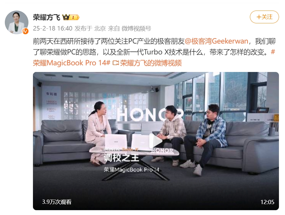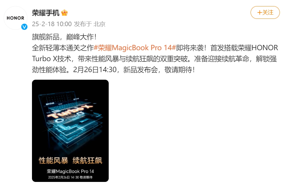 榮耀MagicBook Pro 14定檔2月26日 方飛劇透全新Turbo X