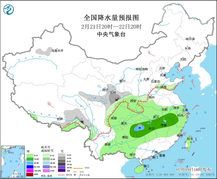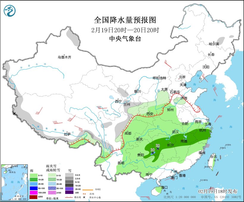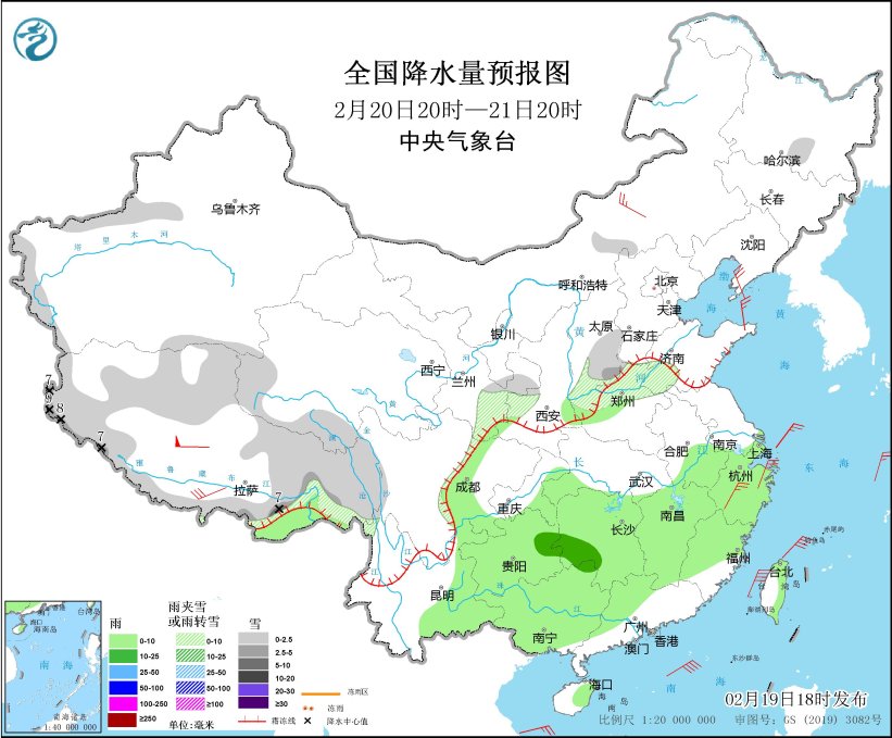 *2月19日20時至20日20時,*黑龍江東南部、新疆阿勒泰和南疆西部山區、西藏東部和南部、甘肅中南部、陝西中南部、山西中部、山東西部、川西高原北部、雲南西北部等地部分地區有小雪或雨夾雪,其中,西藏西部等地部分地區有中到大雪(5~7毫米)。西北地區東南部、黃淮西部、江淮西部、江漢、江南、西南地區東部、華南北部和西部等地部分地區有小到中雨,其中,湖南南部和西部、貴州東南部等地部分地區有大雨(25~30毫米)。內蒙古中部、青海南部、遼東半島等地部分地區有4~6級風,西藏中北部部分地區有6~7級風;東海南部、台灣海峽、巴士海峽、南海東北部等海域有6~7級風,陣風8級(見圖1)。