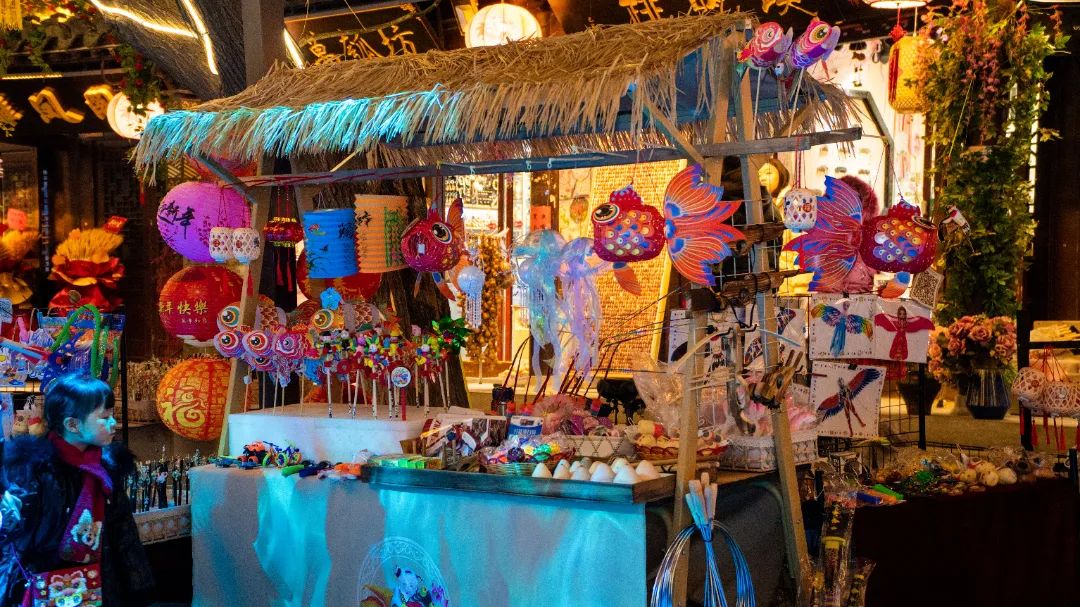 周邊綠化工程升級讓白天綠起來,景區內無處不在的燈飾元素則讓古鎮的夜晚亮起來。24組大型燈組、10組裝飾燈組、沿街店鋪的燈箱牌匾、打在牆上的彩色氛圍燈、投影在地上的年畫燈影,配合各類仿真植物布展、打卡美陳裝飾,再加上掛滿我和我的小姐妹們枝頭的年畫燈籠、詩詞燈帶,共同為古鎮夜間經濟打造出一片“不夜天”。