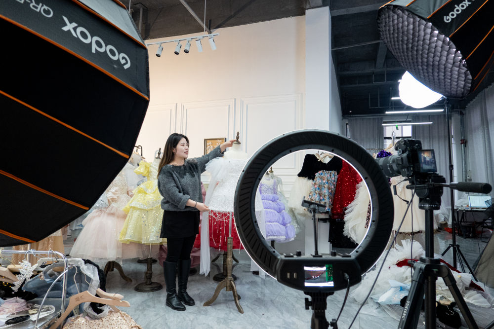 在丁集鎮,主播正在抖音平台上直播銷售兒童禮服。新華社記者 趙金正 攝