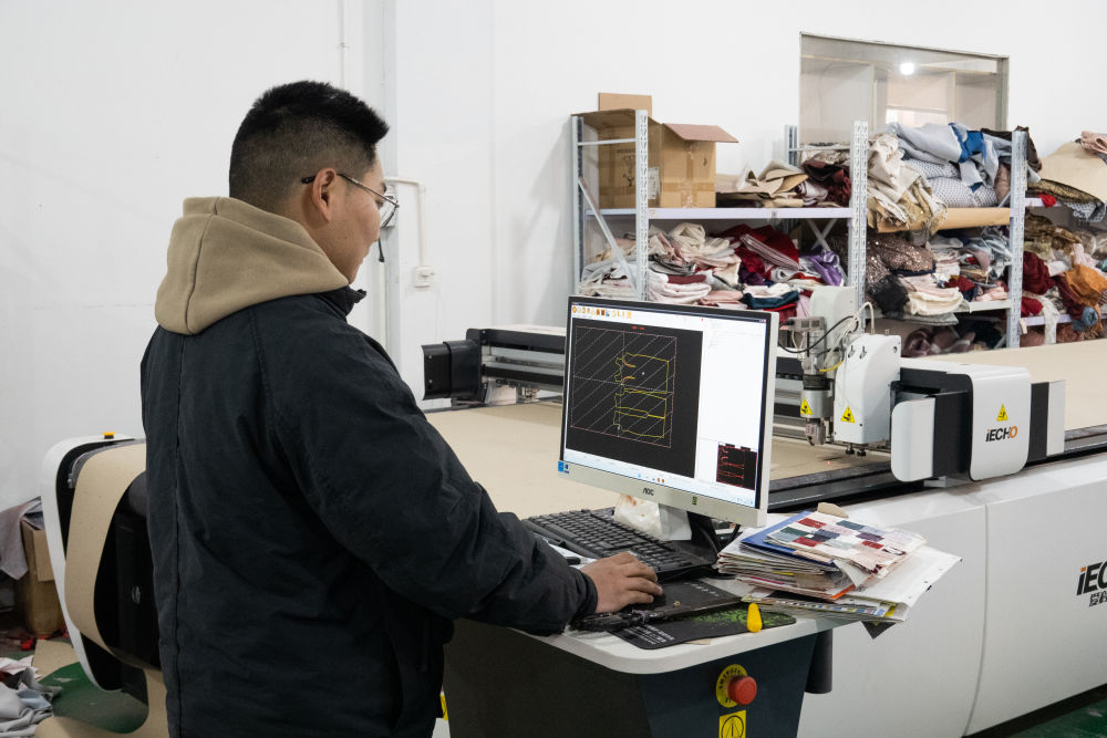 六安市忠緣婚紗禮服有限公司工廠負責人許小龍在操作電腦自動裁牀。新華社記者 趙金正 攝