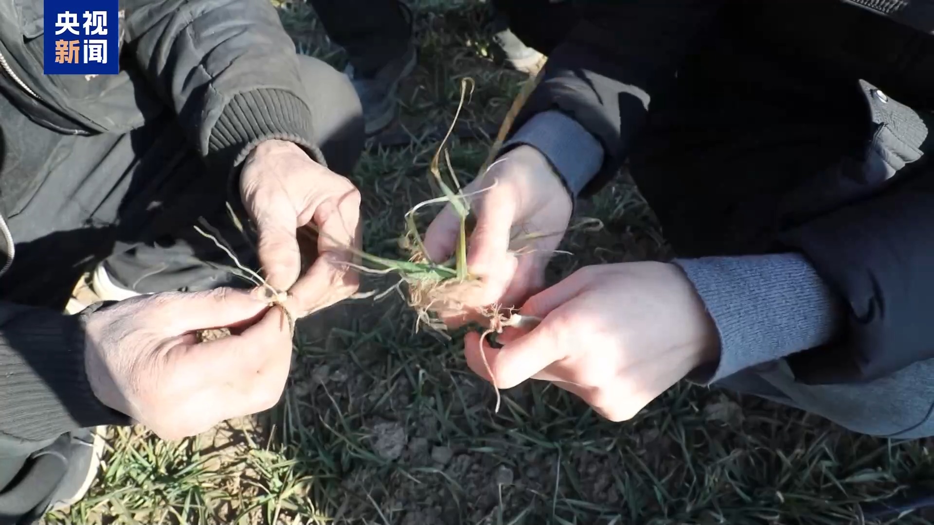 在山東煙台招遠市一處麥田裏,農技專家正仔細查看小麥的生長情況。