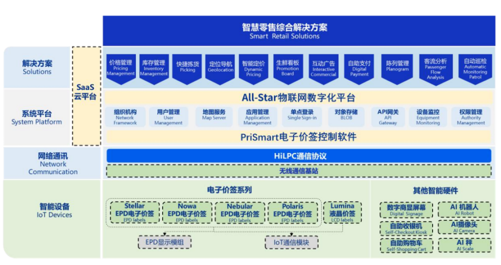 漢朔科技,作為全球知名的物聯網軟硬件一體化解決方案提供商,以物聯網無線通信技術為核心,其最新一代 HiLPC 協議技術領先,單門店能夠承載數百台蜂窩網絡基站設備,單基站每小時可更新 60,000 片次電子價籤設備,併發量達到行業先進水平。