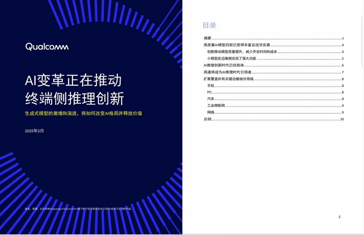 針對這一重要時刻,高通發佈了最新白皮書《AI變革正在推動終端側推理創新》。白皮書深入分析了DeepSeek R1推出背後所代表的更廣泛的AI行業趨勢。指出在訓練成本下降、快速推理部署以及針對邊緣環境的創新推動下,AI正經歷着重要的變革。科技行業的焦點已經不再侷限於構建更大的模型,而是轉向如何在邊緣側實際應用中高效地部署模型。這一轉變已經催生了大量更智能、更小型、更高效的模型,使得各行業能夠更快地規模化集成AI,特別是在終端側的加速集成。