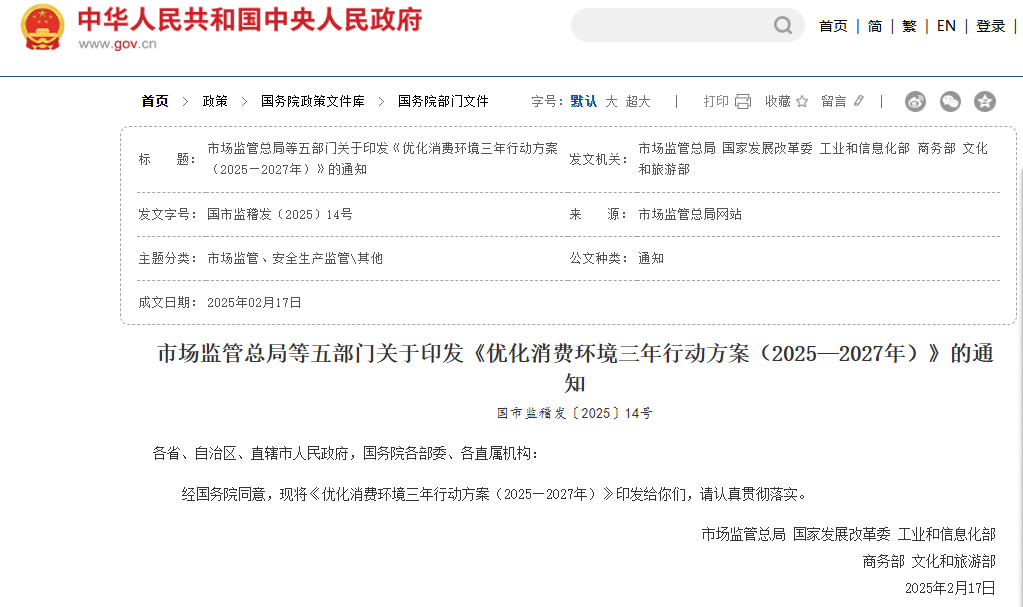 【環球網消費綜合報道】2月19日,國家市場監督管理總局聯合國家發展改革委、工業和信息化部、商務部、文化和旅遊部等五部門共同發佈《優化消費環境三年行動方案(2025—2027年)》(以下簡稱《行動方案》),通過一系列措施全面提升我國消費環境,推動消費市場向高質量發展邁進。
