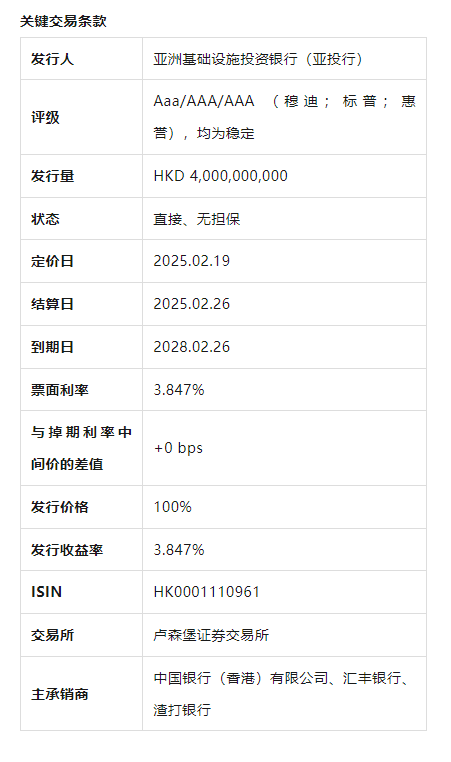 亞洲基礎設施投資銀行(亞投行,AAA/Aaa/AAA)於2月19日完成了其首筆港元(HKD)公開發行基準債券的定價,此次交易也標誌着國際發行人首次以公開形式發行債券,並將通過債務工具中央結算系統(CMU)進行本地結算。