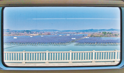 我是浙江安吉人,乘坐G7500次列車,從杭州東站出發回家。當列車快到安吉時,窗外出現一片水域,只見一排排藍色的光伏發電板立於水中,在陽光下熠熠生輝。