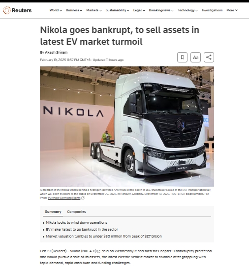 “他們面臨的種種困境,加上日益激烈的競爭、運營挑戰以及整個電動車行業的高成本,所有這些因素共同作用導致了現在的局面,“債務重組分析公司Debtwire法律主管莎拉·福斯稱。此外,Nikola 最初生產電池驅動的半掛卡車,後轉向使用氫能源的電動卡車。該公司表示將啓動資產出售程序以實現價值最大化並有序退出。