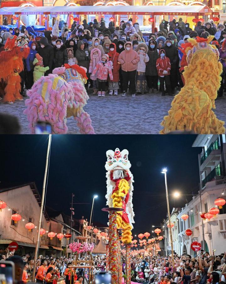 拼版照片:上圖為市民在瀋陽新春皇寺廟會上觀看舞獅表演(2023年1月23日新華社記者楊青攝)。下圖為人們在馬來西亞檳城廟會上觀看舞獅表演(2025年2月1日新華社發李奕慧攝)。