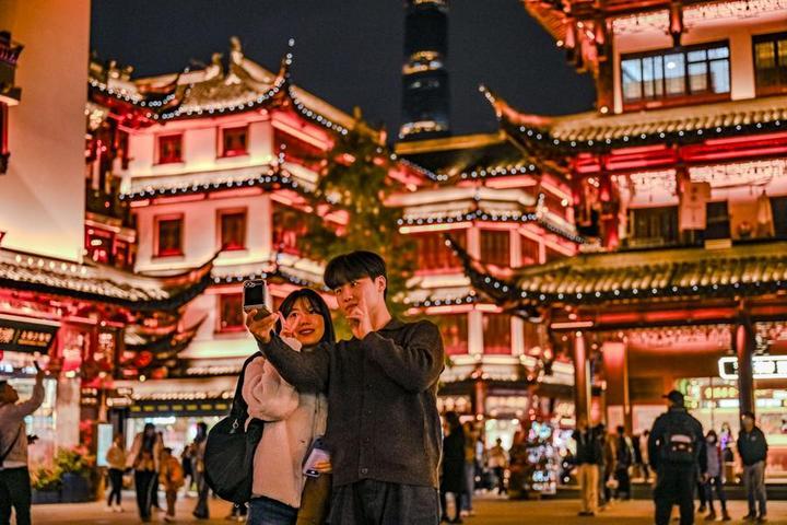2024年12月4日,來自韓國的遊客在上海豫園商城自拍。新華社發(陳浩明攝)