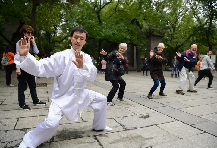 這是西安“80後”小夥趙慶(前)在小雁塔景區內向外國遊客教授楊氏太極拳動作。新華社記者邵瑞攝