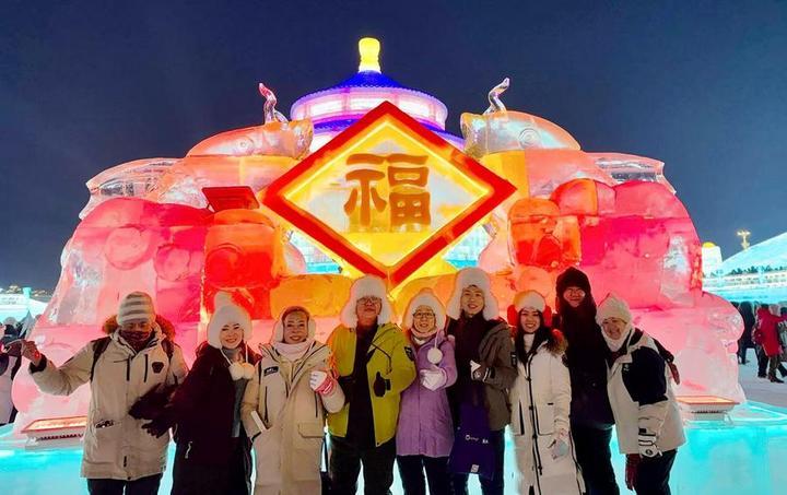 2月1日,馬來西亞遊客陳新全(右四)在黑龍江省哈爾濱冰雪大世界遊玩時與旅行團友合影(受訪者提供)。