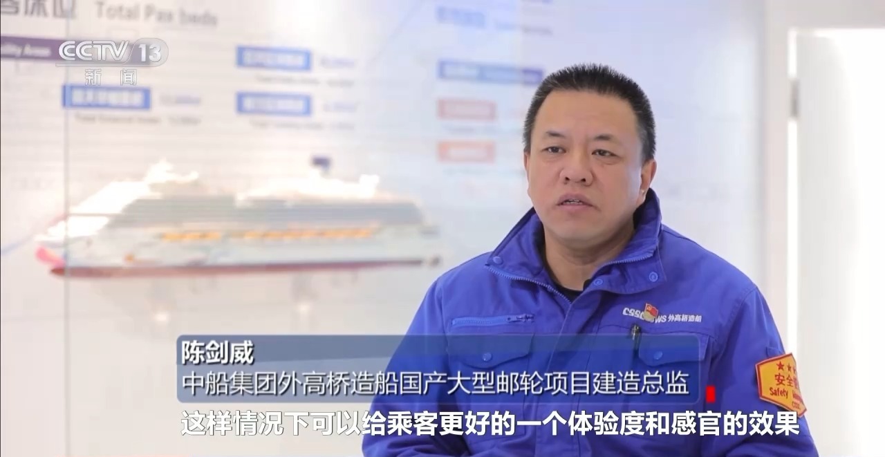 *中船集團外高橋造船國產大型郵輪項目建造總監 陳劍威:*公區增加了很多,大約八千個平方米,可以給乘客更好的一個感官效果。為了控制重心,用了一些新材料,更加平穩的話,可能乘客暈船現象會比較少一點。
