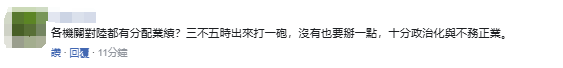 對於台灣教育部門的舉動,有島內網友在台媒相關報道評論區留言稱,“各機關對(大)陸都有分配業績?三不五時出來打一炮,沒有也要掰一點,十分政治化與不務正業”。