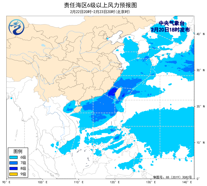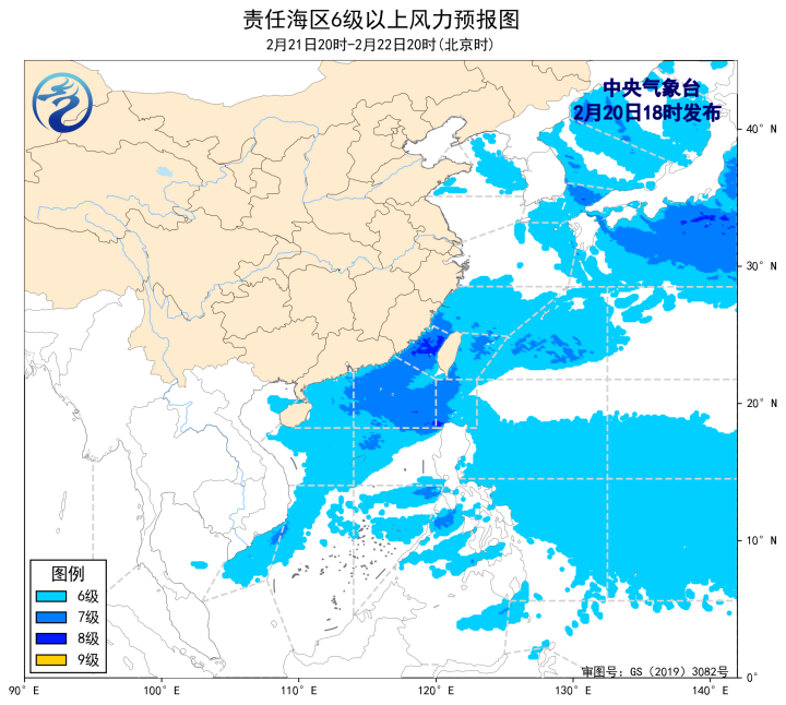 2月20日02時至14時,東海北部海域、台灣海峽出現了5~7級、陣風8級的偏北風,東海南部海域、巴士海峽、南海北部海域、南海中西部海域、南海西南部海域出現了5~7級、陣風8級的東北風或偏東風。