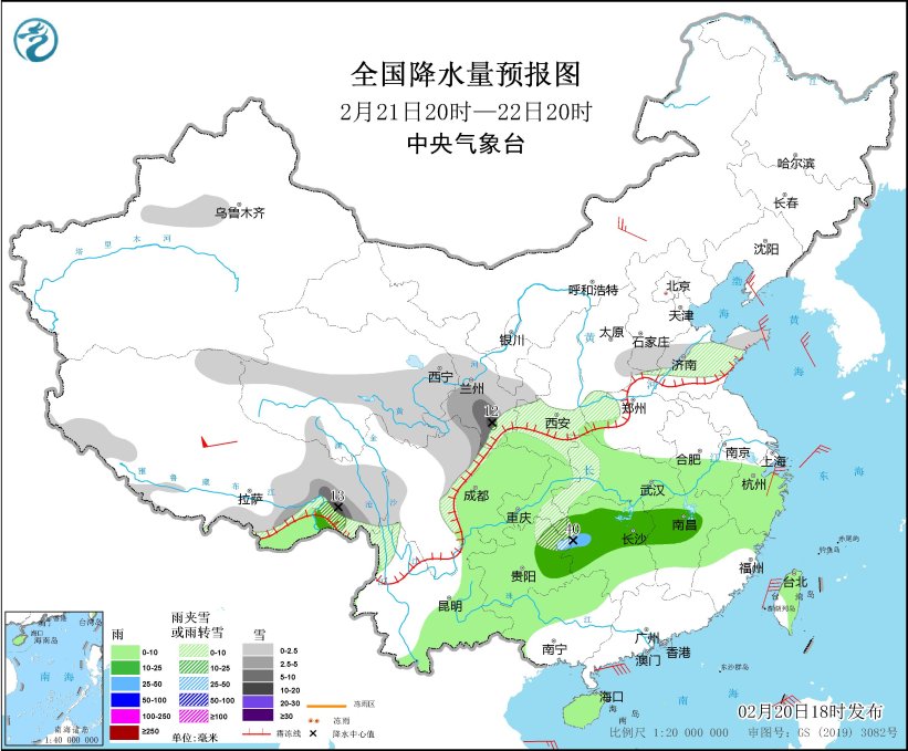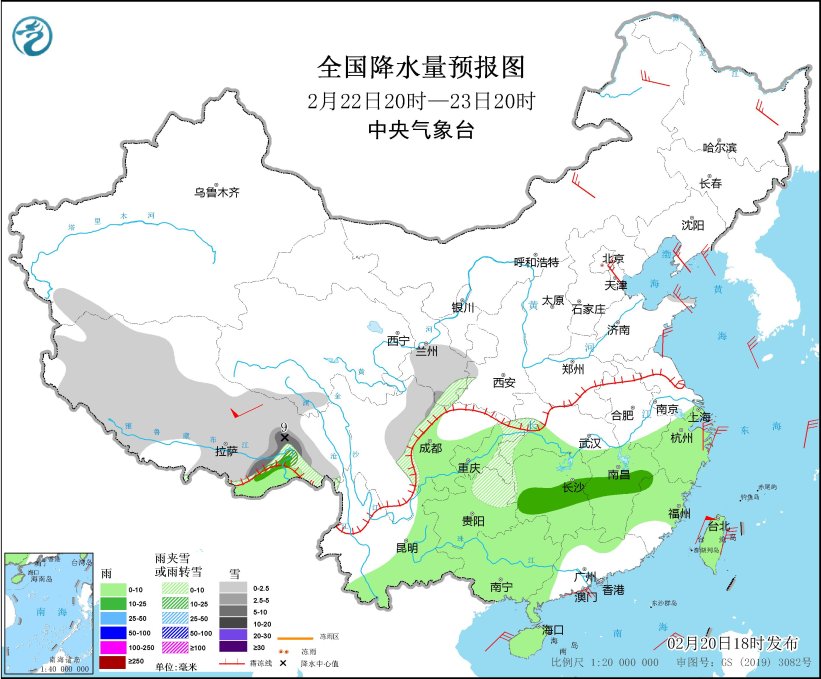 *2月21日20時至22日20時,*西藏南部和東部、川西高原北部、青海東部和南部、甘肅中南部、陝西南部、湖北西部、河南西部、河北南部、山東中部等地部分地區有小到中雪或雨夾雪,其中,西藏東南部、甘肅南部等地部分地區有大雪,局地暴雪(10~13毫米)。江淮西部、江漢大部、江南大部、西南地區東部、雲南東南部、廣西西部、海南島、台灣島北部等地部分地區有小到中雨,其中,湖南西部等地局部地區有大雨(25~40毫米)。內蒙古中部、遼東半島、山東半島、浙江東部等地部分地區有4~6級風,西藏中部部分地區有7~8級風;東海南部、台灣海峽、台灣以東洋麪、巴士海峽、南海中北部等海域將有6~8級風、陣風9級(見圖2)。