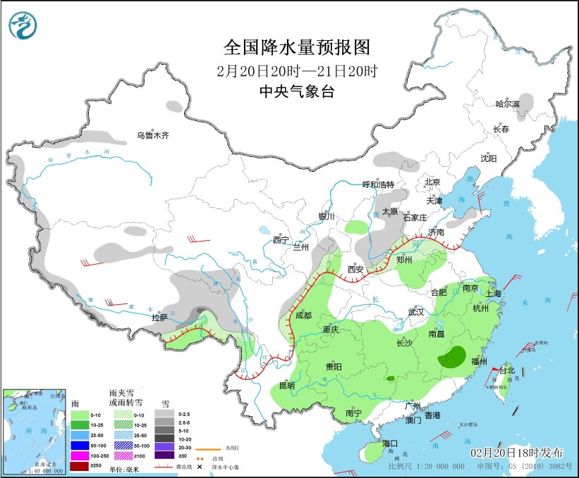 *2月20日20時至21日20時,*內蒙古中部、新疆南疆西部山區、西藏北部和中東部、青海南部、甘肅南部、寧夏南部、陝西東部、華北南部和西部、黑龍江東南部、黃淮西部、山東半島北部等地部分地區有小雪或雨夾雪,其中,西藏東南部等地部分地區有中雪,西藏南部等地局地暴雪(10~11毫米)。江淮西部、江南、西南地區東部和南部、華南大部等地部分地區有小雨,其中,江西東南部、福建西部等地部分地區有中雨。西藏中西部、青海西部等地部分地區有5~6級風;東海南部、台灣海峽、巴士海峽、南海東北部等海域有6~7級風,陣風8級(見圖1)。