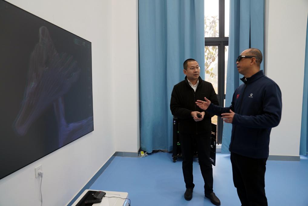 2月17日,在廣西體育高等專科學校,韋軍與運動健康學院的老師交流,瞭解3D模擬運動解剖模型如何助力教學。新華社記者 陳露緣 攝