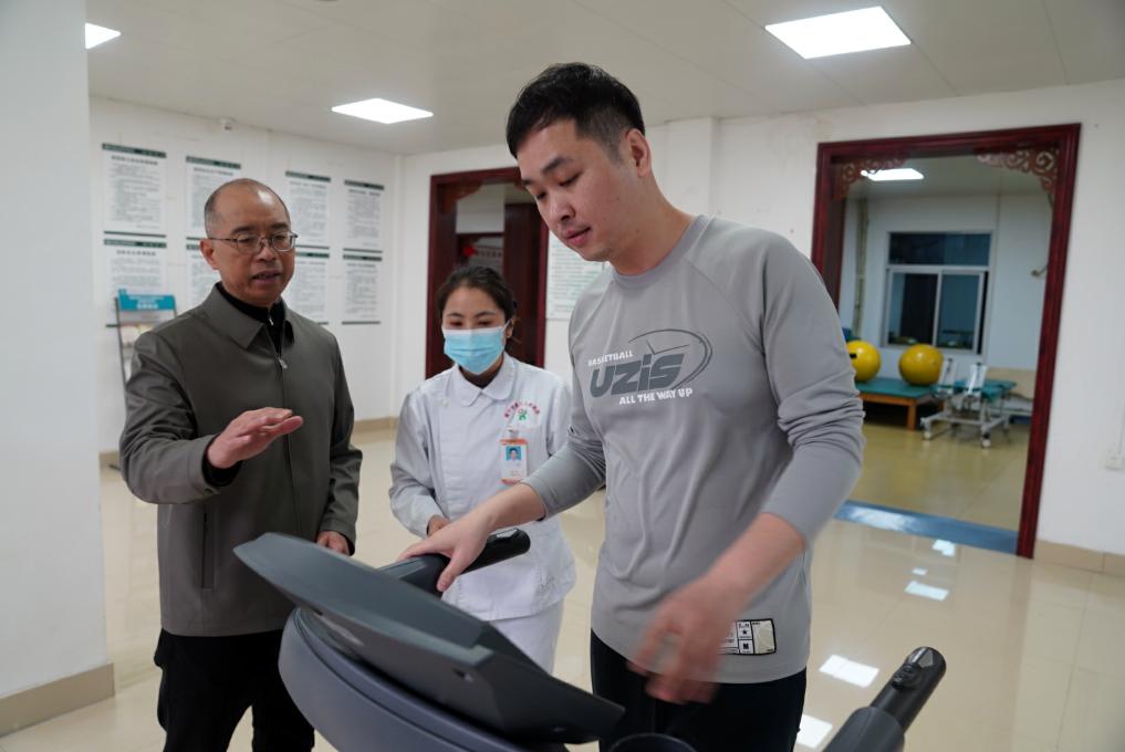 2月18日,韋軍在廣西南寧市西鄉塘區衡陽街道南鐵社區衞生服務中心走訪,瞭解衞生服務中心對羣眾進行運動指導的情況。新華社記者 陳露緣 攝