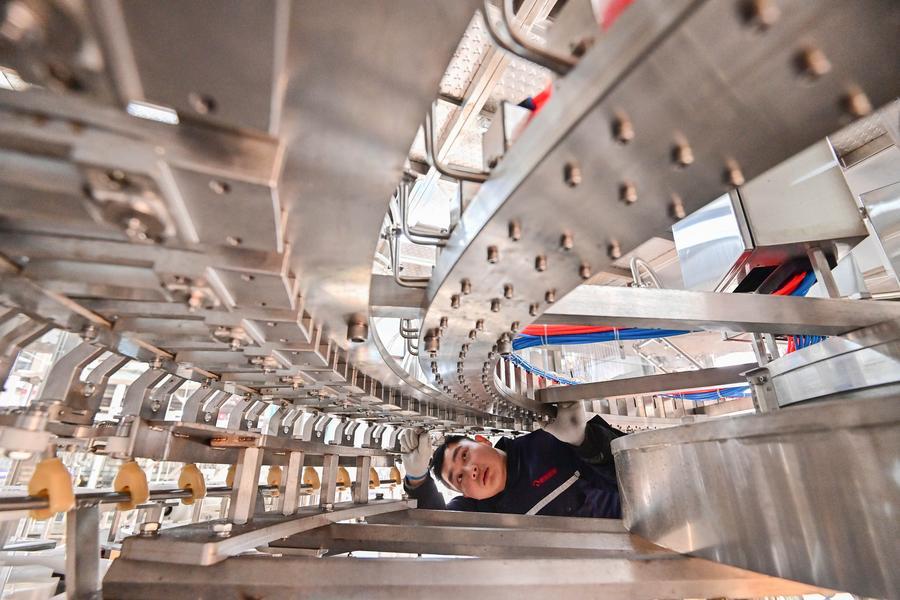 2月14日,在山東省青州經濟開發區一家灌裝設備製造企業,工人在車間內裝配作業。新華社發(王繼林攝)
