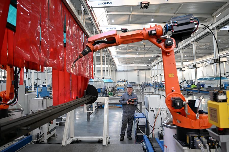 2月18日,工人在唐山百川機器人共享智能製造工廠內測試機器人產品性能。新華社記者 牟宇 攝