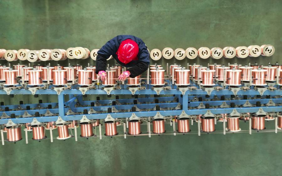2月13日,在山東省東營市廣饒縣李鵲鎮的一家電纜公司的生產車間內,工人在進行束絲作業(無人機照片)。新華社發(劉雲傑攝)