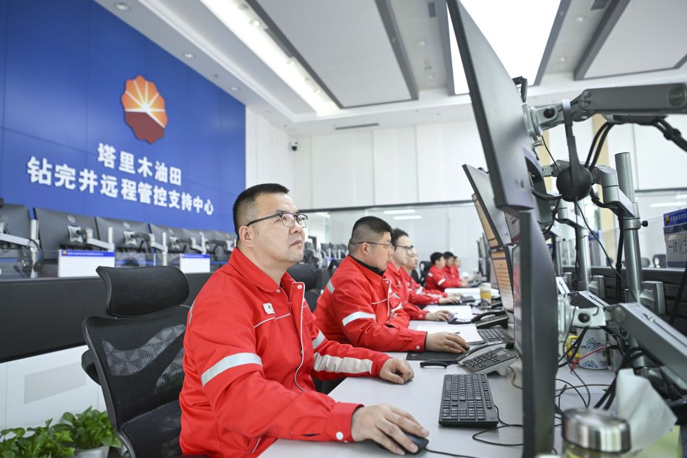 2025年2月18日,在位於新疆庫爾勒市的塔里木油田鑽完井遠程管控支持中心,工作人員通過遠程平台查看設備運行狀態。新華社記者 胡虎虎 攝