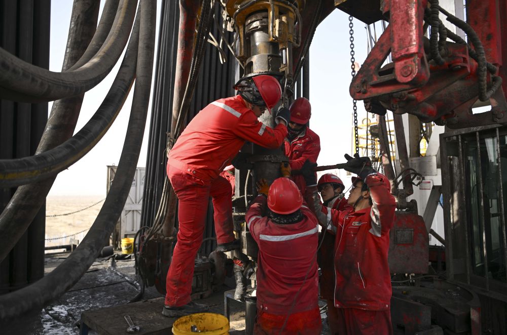 2025年2月19日,工人在中國石油塔里木油田深地塔科1井上施工。新華社記者 胡虎虎 攝