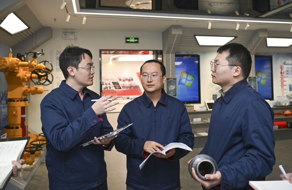 2025年2月18日,中國石油塔里木油田油氣工藝研究院鑽井項目部青年科研人員在一起交流。新華社記者 胡虎虎 攝
