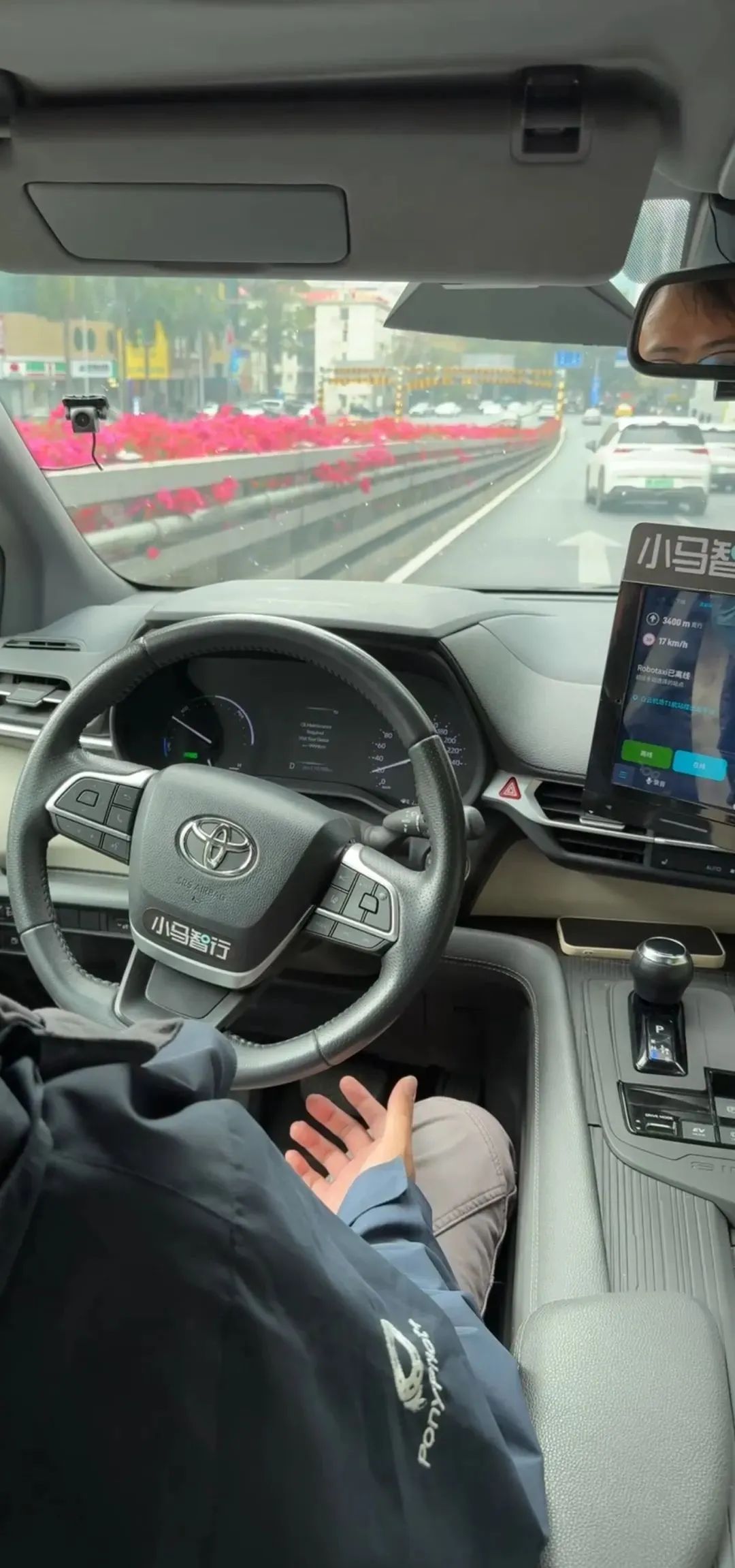 此次來接送我們的是一台七座的MPV。坐進車內,只見前排座椅中央,一塊電子屏,正即時顯示着車輛的工作狀態,如即時路線等。乘客按規定需坐在第二、三排座位,但車內整潔寬敞,座椅舒適。在第二排座椅前方左右兩側,還分別各有一塊屏幕,能為乘客提供音樂、視頻等娛樂功能;該屏幕也可以調節車內空調,或查看車輛自動駕駛動態情況,如避讓周邊車輛、行人、等待紅綠燈等可一目瞭然。