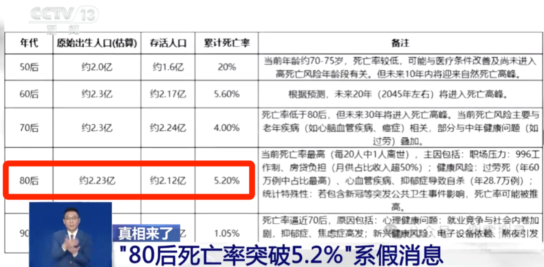 “80後5.2%的死亡率,開啓了黃金一代的黯然離場”“當80後開始集體謝幕——5.2%死亡率背後,一代人的生存困境與時代之殤”……網絡上有不少引用所謂80後死亡率數據的文章,還有不少自媒體在渲染80後的生活狀況。