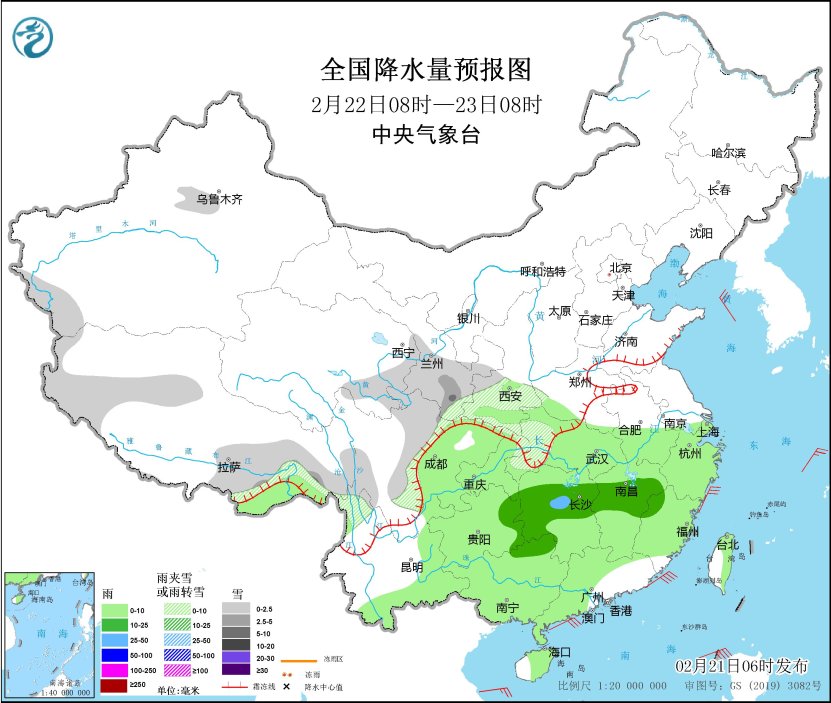 2月22日08時至23日08時, 新疆沿天山地區和西部、西藏西部和東南部、青海東部、甘肅南部、陝西南部、湖北西部、川西高原等地部分地區有小到中雪或雨夾雪,其中,甘肅東南部局地大雪。江淮西部、江漢大部、江南、西南地區東部、華南大部等地部分地區有小到中雨,局地大雨(見圖2)。