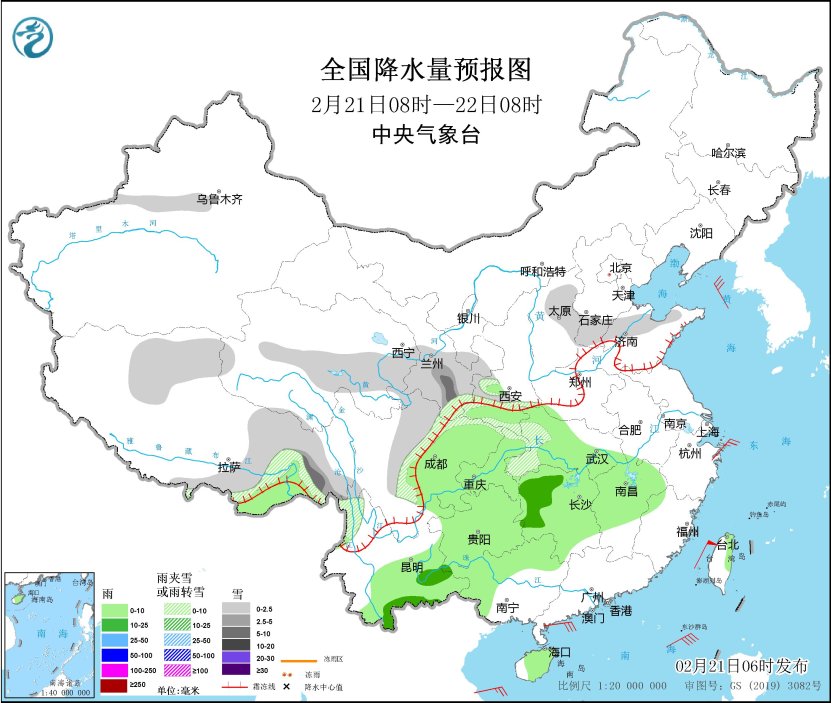 2月21日08時至22日08時, 新疆沿天山地區、西藏北部和東部、青海中東部、甘肅南部、山西東部、山東北部、湖北西部、川西高原東部等地部分地區有小雪或雨夾雪,其中,西藏東部、甘肅南部等地部分地區有中到大雪。西藏東南部、江漢大部、江南中北部和西部、西南地區東部和南部、廣西西部和北部、海南島等地部分地區有小雨,其中,湖南北部和西部、雲南南部等地部分地區有中雨。浙江北部部分地區有4~5級風(見圖1)。