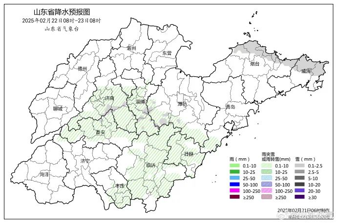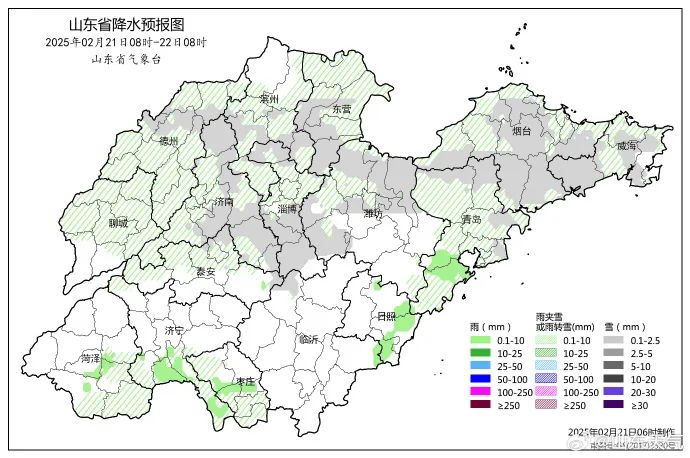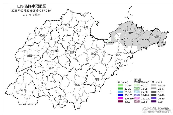 另據“山東天氣”微博,預計未來三天受弱冷空氣影響,我省大部地區天氣多雲間陰轉晴,部分地區有小雨雪,南風轉北風,氣温下降。其中,21日夜間魯西北、魯中和半島地區局部有小雪或雨夾雪;22日臨沂、日照、魯中、煙台北部和威海局部有小雪或雨夾雪;23日煙台北部和威海局部有小雪。