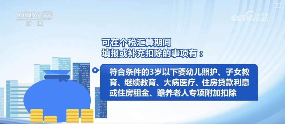符合條件的3歲以下嬰幼兒照護、子女教育、繼續教育、大病醫療、住房貸款利息或住房租金、贍養老人專項附加扣除;