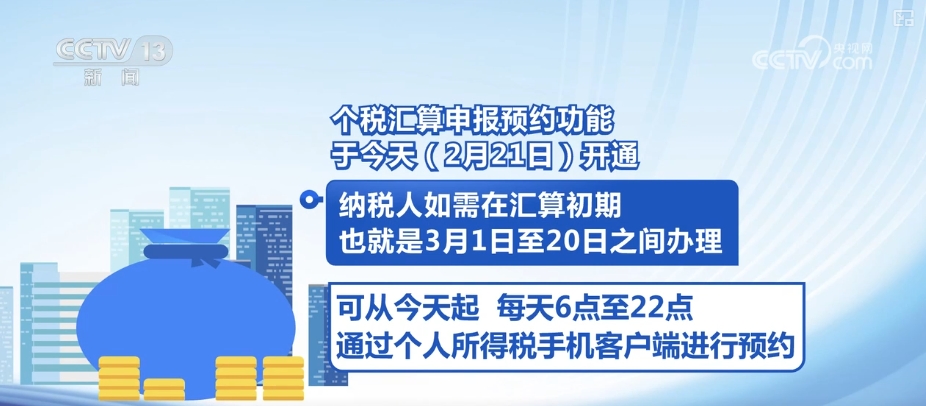 *央視網消息:*記者從國家税務總局瞭解到,2024年度個税彙算將於3月1日—6月30日進行,申報預約功能於2月21日開通。納税人如需在彙算初期也就是3月1日—20日辦理,可從2月21日起,每天6時—22時通過個人所得税手機客户端進行預約。3月21日—6月30日,納税人無需預約,可隨時辦理。