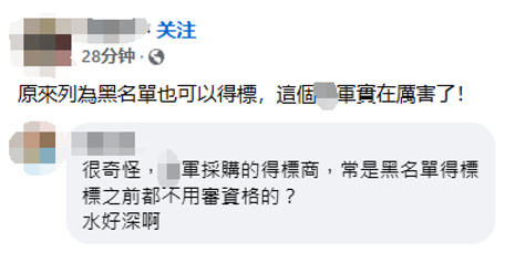對此,有島內網友評論説,“原來列為黑名單也可以得標,這個台軍實在厲害了!”“很奇怪,台軍採購的得標商,常是黑名單得標,之前都不用審資格?水好深啊”。