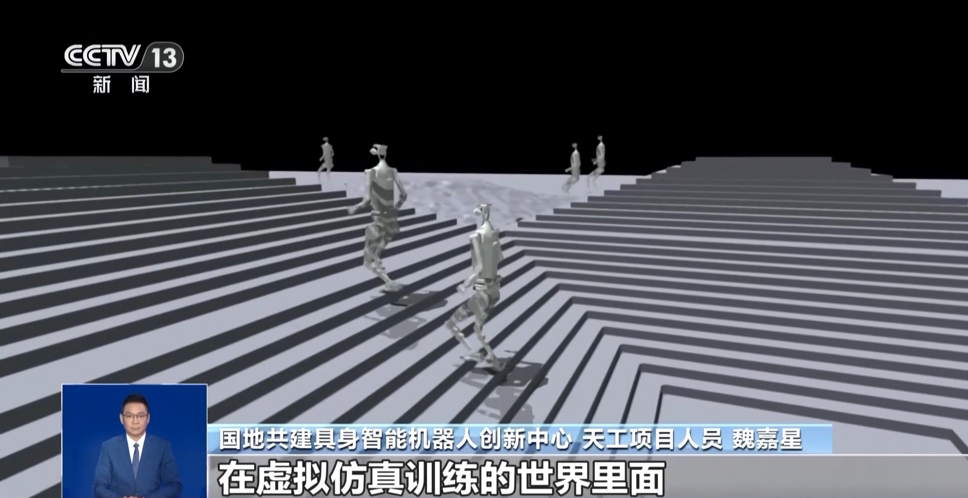 國地共建具身智能機器人創新中心天工項目人員 魏嘉星:對於人形機器人來説,要做到穩定的感知行走,其實對於它的整個計算能力是有非常高的要求的,要保持50毫秒以內的高頻率視覺更新。同時我們會把視覺感知的一些信息和本體信息,在虛擬仿真訓練的世界裏進行部署。部署好了之後,會有成百上千台機器人結合這種算法進行優化和迭代。我們把效果訓練好之後,再部署到真實物理世界的機器人身上,就可以讓它具備一個很好的感知行走能力了。