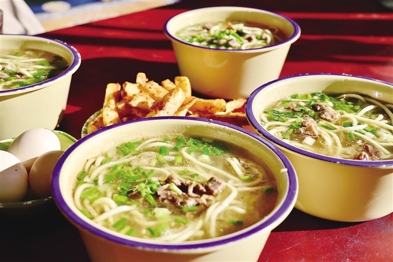 在西藏,人們總能將簡單的食材做出獨一無二的“西藏味道”。一壺甜茶,一碗藏面,一份炸土豆或肉餅,便是這裏最標準的早餐套餐。清水、紅茶茶葉、甜奶粉或犛牛奶,只需簡單的食材,便能製作出茶香濃郁、奶味醇厚的甜茶。在略帶寒意的初春,喝上一口,整個身子都暖了起來。此時搭配一碗筋道的藏面,簡單又滿足。